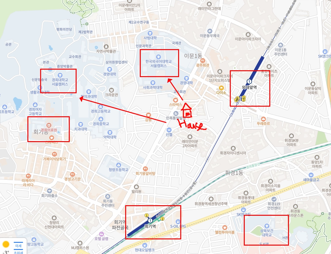 외국어대학교 도보 5분! 경희대학교 도보 15분! 시립대 버스20분! 거리에 위치한 외대하우스는