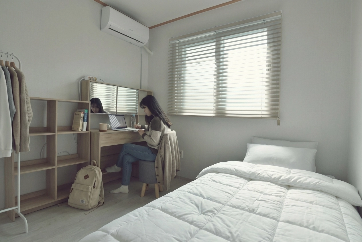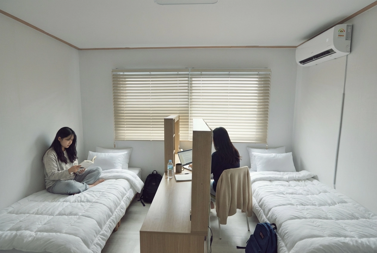 Fixed 100,000 KRW per person. Includes utilities (electricity, gas, water), communal supplies (toilet paper, detergent, etc.), and monthly cleaning service (120,000 KRW for apartments). For more details, click here