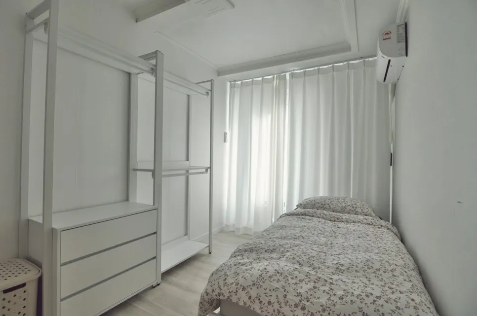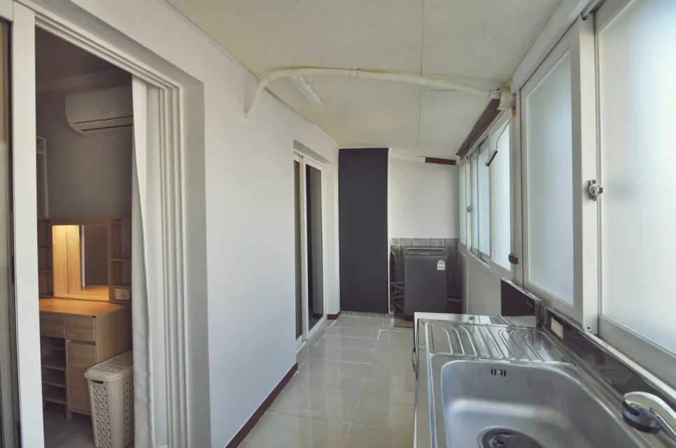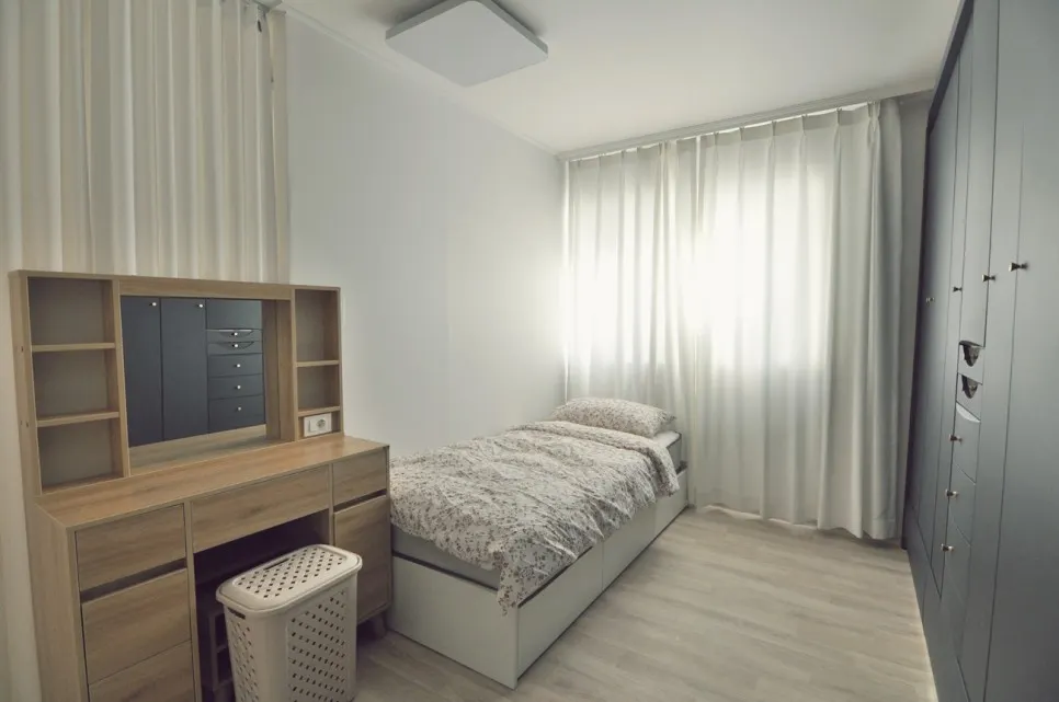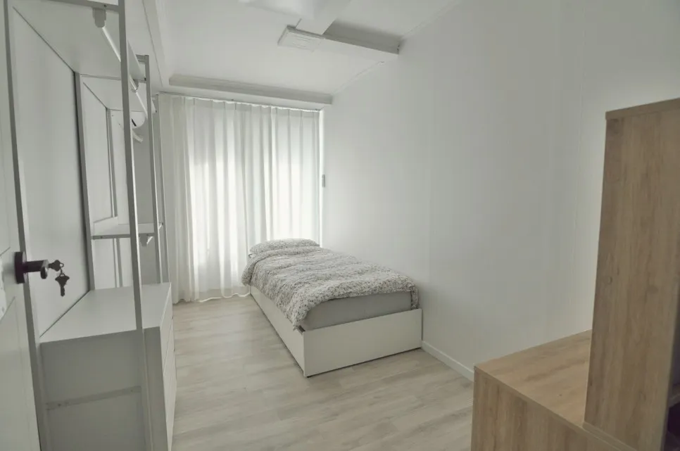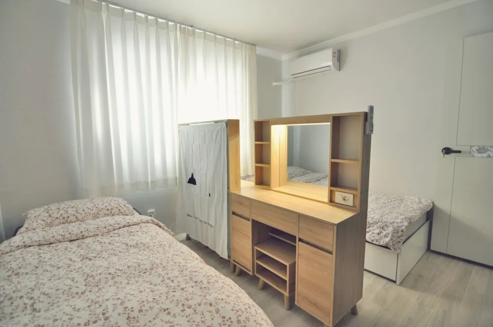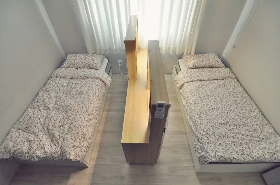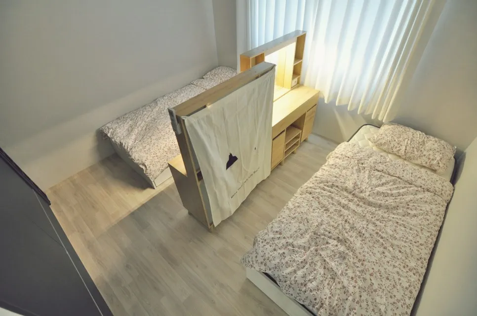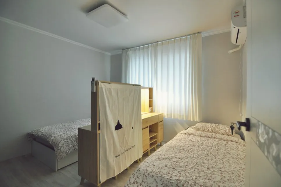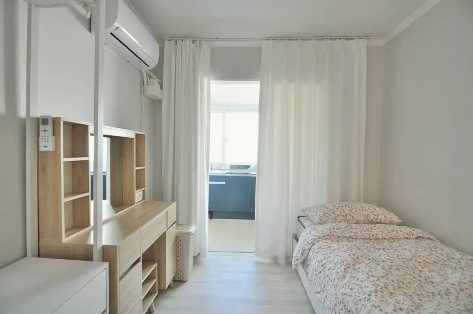 창문이 통창문으로 되어 채광 또는 환기 정말 좋습니다. 바깥에 샷시 , 안에도 샷시로 이중으로 처리 되어 있어 방에 찬바람이 들어오는 구조가 아니랍니다 :) 특히 이 1인실A는 1인실B 사람과 둘만 쓸 수 있는 미니 주방 및 세탁실이 별도로 제공됩니다.