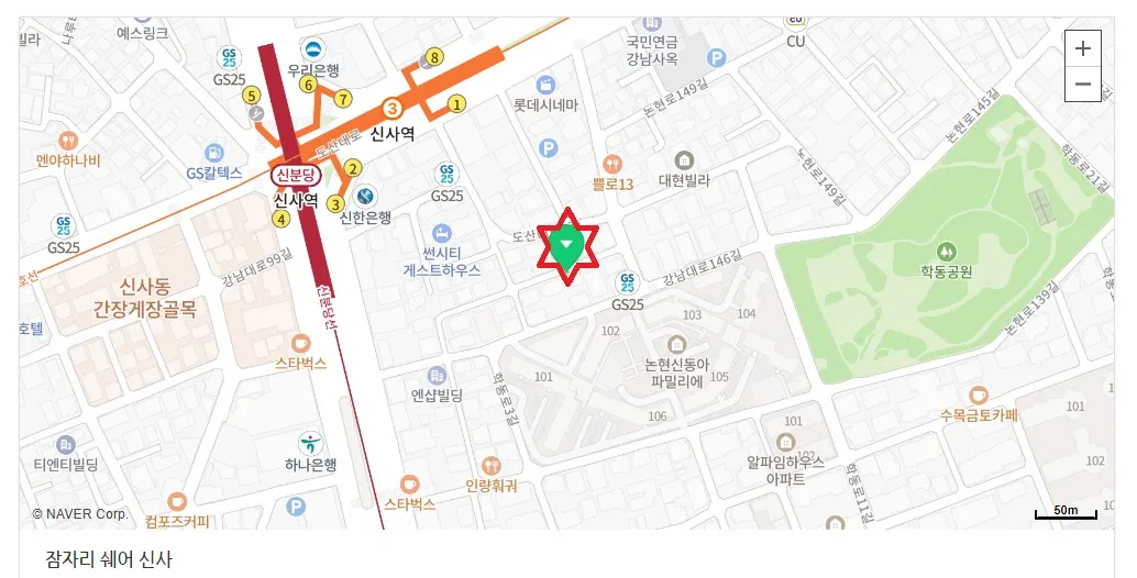 You can even walk to Sinsa Station in less than 2 minutes from the quiet residential area.
